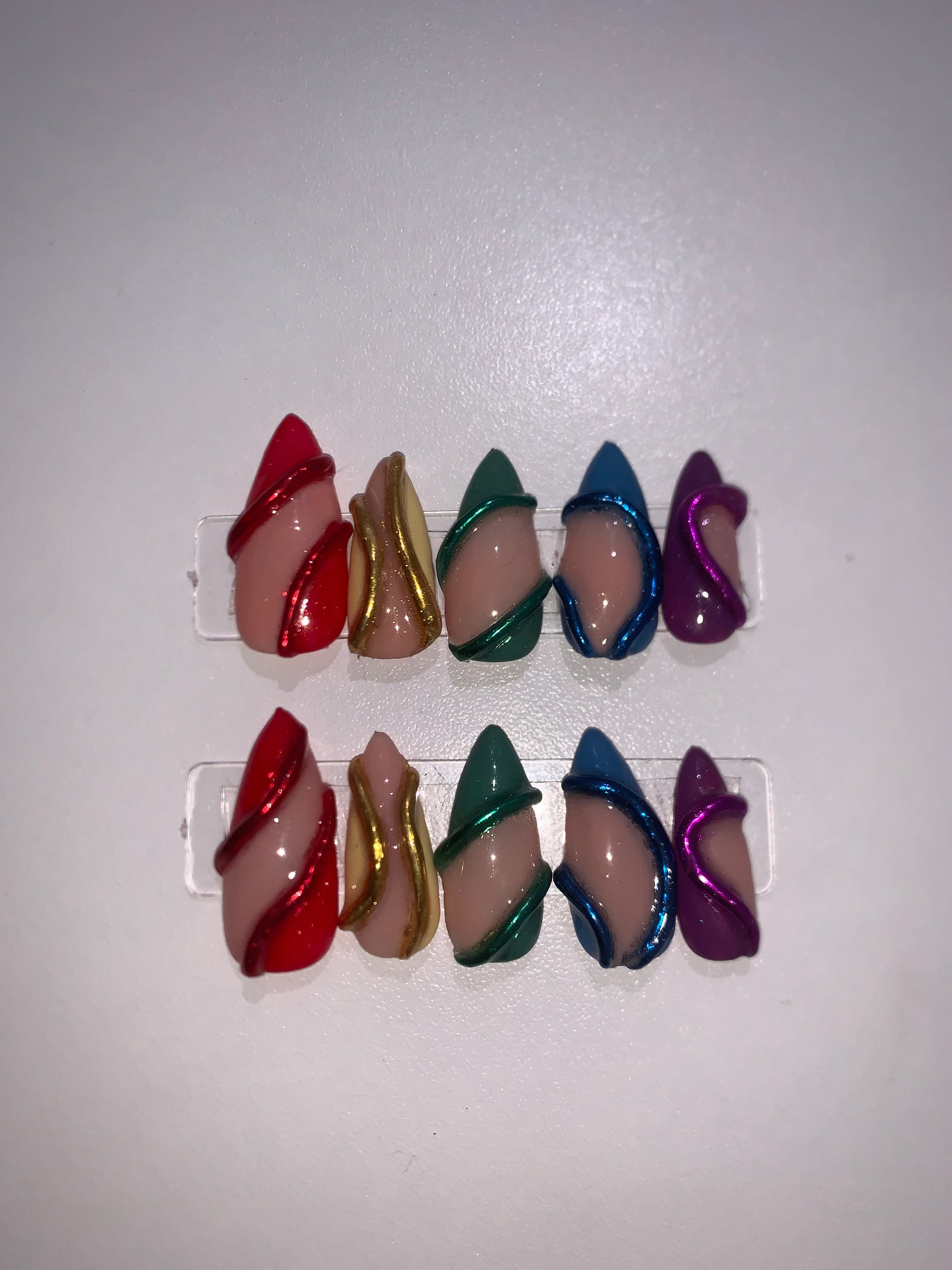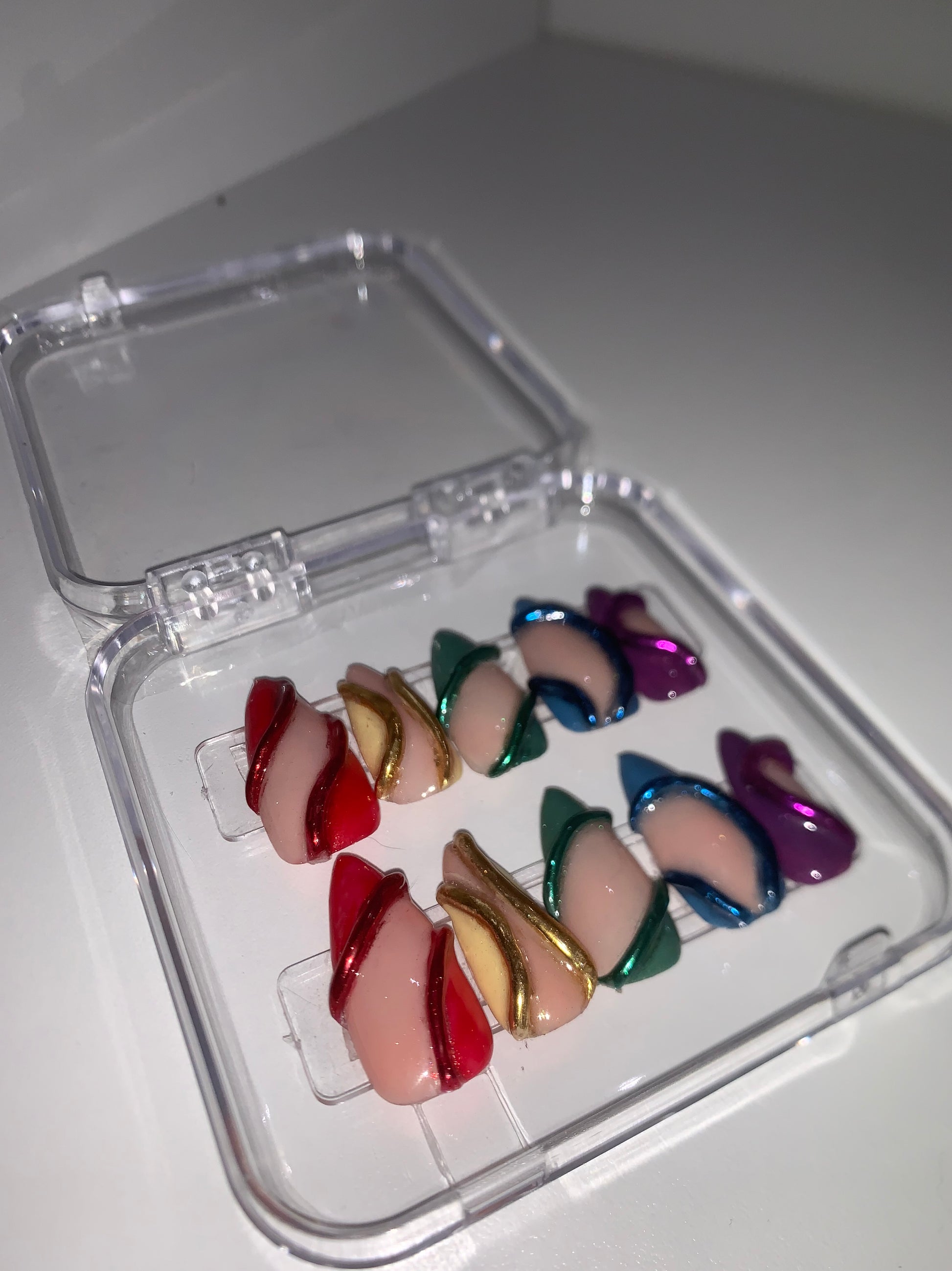 ongles PressOn, couleur arc en ciel, boudins 3D chrome. 🌈