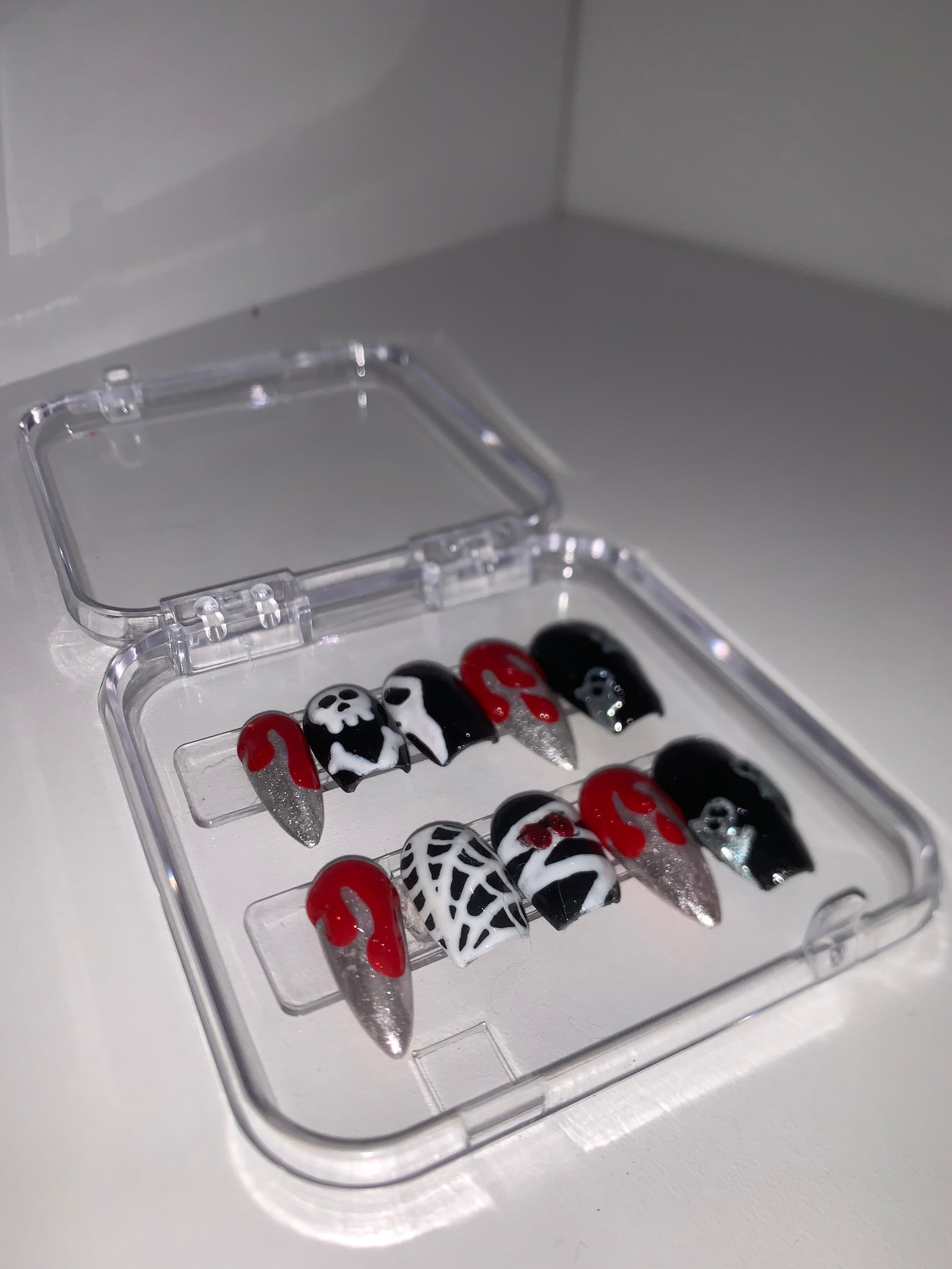 Set spécial!! Ce set a été fait par ma meilleure amie, elle s'est merveilleusement bien debrouillée ! ongles PressOn, set halloween effet dents de vampire motifs divers 🎃